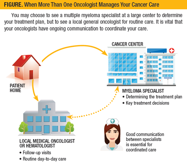 You may choose more than one oncologist to manage your cancer care (Figure). For example, you may choose to see a myeloma specialist at a large cancer center when determining your treatment plan, or when key treatment decisions need to be made, such as stem-cell transplant may be a treatment option.