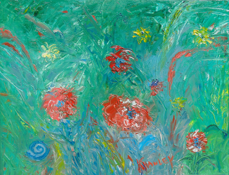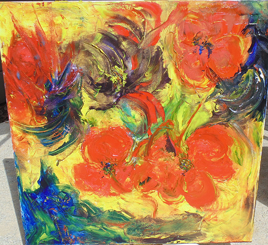 I am a 5-time lung cancer survivor. I call this art “Serene Survivor.” I donated it to the Halifax Health Hospital in Daytona Beach, FL, which is where I am being treated for my fifth cancer recurrence. I made this painting bright to cheer up patients, because the hospital pictures are not pretty and bright.