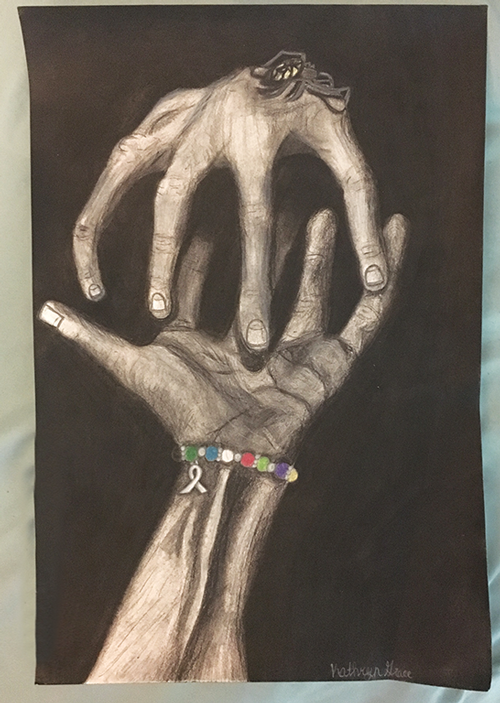 This piece is made of charcoal and colored pastel and depicts two hands reaching out for each other. The hands are coming through the dark, hence some parts of the hands are not fully visible. The meaning is that those who are sick and those who support them go through a dark and unknown part of their life, which can be very frightening, but they refuse to let the darkness take over them, and look to the light and the good. So they reach out for each other and hold on. The spider on the hand represents hope and the chance for a better life and a chance to write their own stories. By reaching out to each other, they grow stronger and are able to help each other, and are happier and closer.