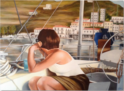 In 2014 I was diagnosed with multiple myeloma. A couple of months later, the place I worked at for 29 years announced it was closing. Out of work at age 62, and feeling the effects of chemo, did not make for good job prospects. One day while visiting my friend, I noticed a photo of her vacationing in Greece. It was the kind of picture made to be a painting, so I spent that summer immersed in my large (4’ × 4’) project, which is this acrylic painting. That, and my dogs by my side, were the medicine I needed. I always try to think one painting ahead now, having turned a hobby into a full-time health benefit.