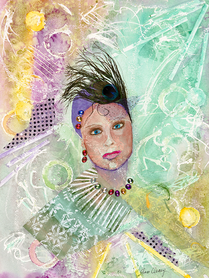 The painting is watercolor and collage. I wanted to express how I felt, trying to make the best of being bald. The woman’s face is not happy, because this is not a gleeful experience, and the cap and feather added a bit of frivolity that is often not felt. I chose light, soft colors and some sparkle to offer hope and uplift spirits.