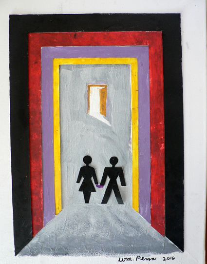 The white frame represents the time when we, as a married couple, were innocent of the disease, and what was about to happen to us. The black stands for the despair that accompanies a cancer diagnosis. The red represents the anger that comes from trying to live a healthy life and still being stricken with this disease. The purple stands for academe and the medical research that may lead not just to a cure, but to prevention as well. The gold is for the hope that springs eternal in every heart. The gray path stands for the uncertainty that is always with those trying to find their way forward to a cure. The bright light spilling out the open door is the hopeful prospect of being able to defeat the disease. The couple, walking hand-in-hand, symbolizes the loving teamwork that makes the difficult journey so much easier to bear.