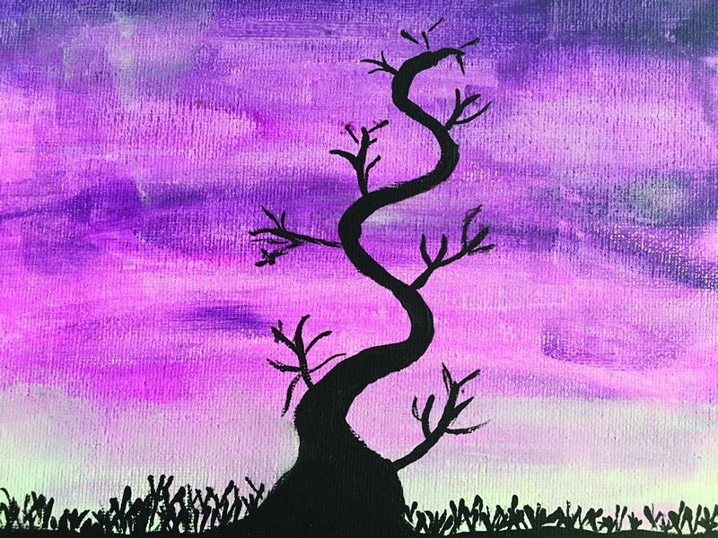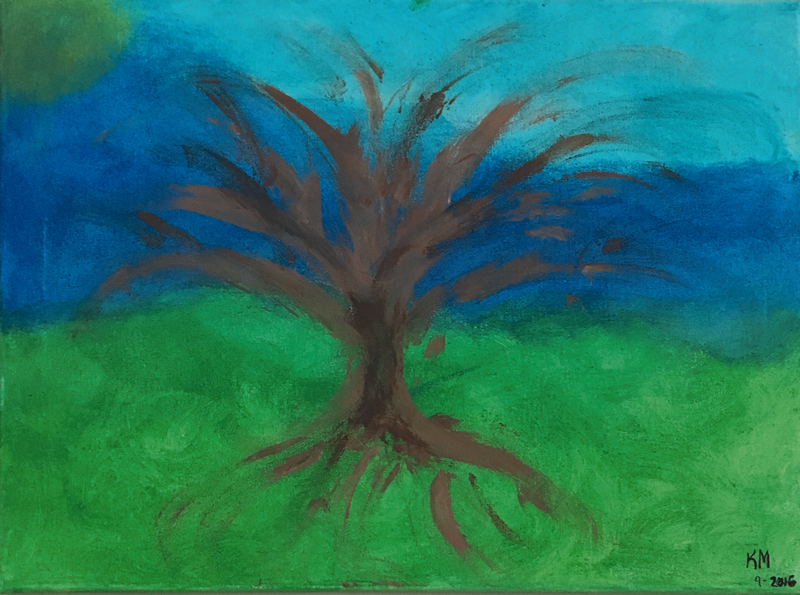 I painted this tree at a breast cancer retreat, while I was going through treatment. This tree shows the sadness and anger that I was feeling. My second acrylic painting, titled “Dark & Twisted,” shows my feelings during treatment, asking “why me”? I try to stay positive, but sometimes I just have to let the dark thoughts and feelings out.