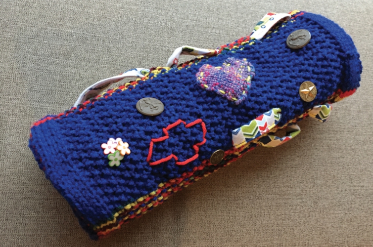 And I’ve since discovered twiddlemuffs as another avenue of charitable comfort. A twiddlemuff is a muff, a knitted tube, with things to twiddle with inside and out. I knit bobbles and textures into the knitting and attach buttons—anything that seems likely to get fussed with.