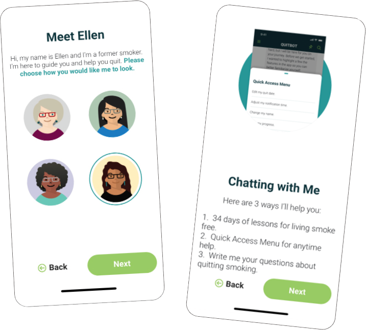 Ellen is the avatar that will help you quit. Like any good coach, she will check with you a couple of times a day to offer praise and encouragement, share charts that show your progress, and teach you skills to stay motivated or deal with cravings.