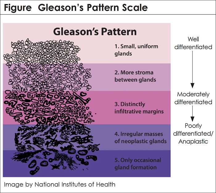 - Grading: The pathologist assigns a grade to the cancer cells based on their appearance. The Gleason grading system ranges from 1 to 5 and describes how much the cells look like healthy tissue (lower score) or abnormal tissue (higher score), with 1 being the least aggressive and 5 being the most aggressive (Figure)3