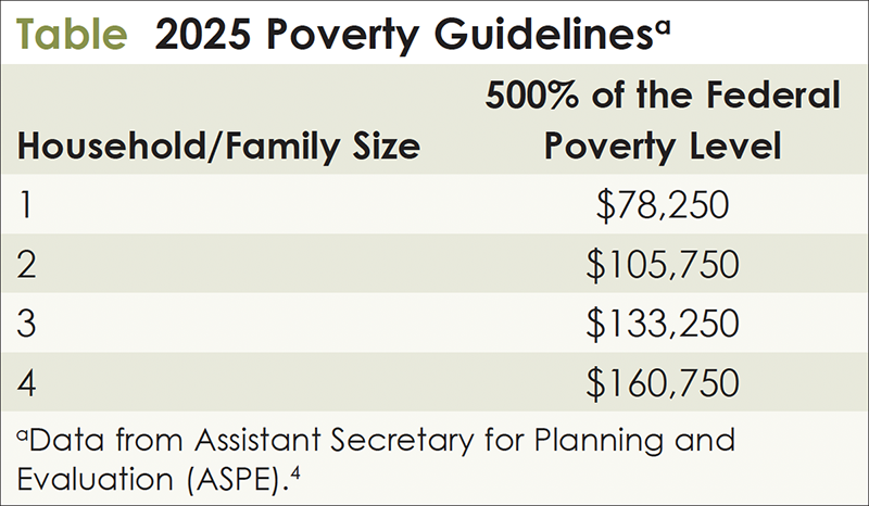 - Office of the Assistant Secretary for Planning and Evaluation (ASPE). Poverty guidelines. 2025. Accessed October 28, 2025. https://aspe.hhs.gov/topics/poverty-economic-mobility/poverty-guidelines