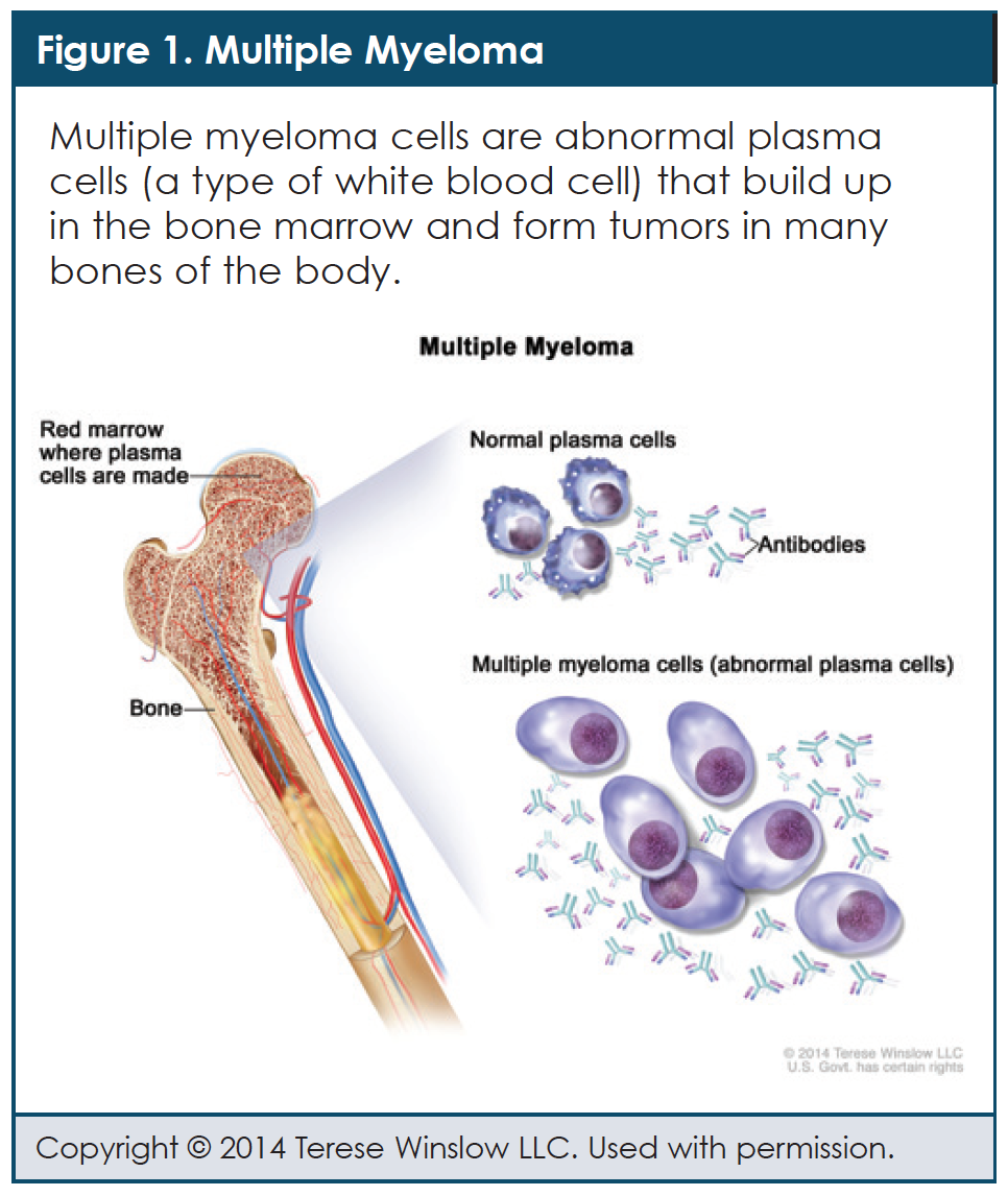 Before reviewing insights related to living with multiple myeloma, it helps to briefly summarize the condition. In multiple myeloma, white blood cells called plasma cells, which are found in the bone marrow, become cancerous or malignant (Figure 1).2 These cancerous plasma cells are called myeloma cells. Growth of myeloma cells often occurs in bones where marrow is very active, such as the spine, skull, rib cage, pelvis, shoulders, and hips. The word “multiple” is used because the disease can occur in several areas of bone. On scans, multiple myeloma can look like a tumor (1 disease site) or can result in several different patches of bone loss.2