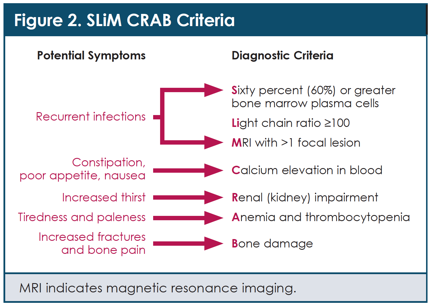 The acronym “SLiM CRAB” can be used to remember some of the common symptoms and signs (diagnostic criteria) that are observed at the time of diagnosis in people with multiple myeloma (Figure 2).3