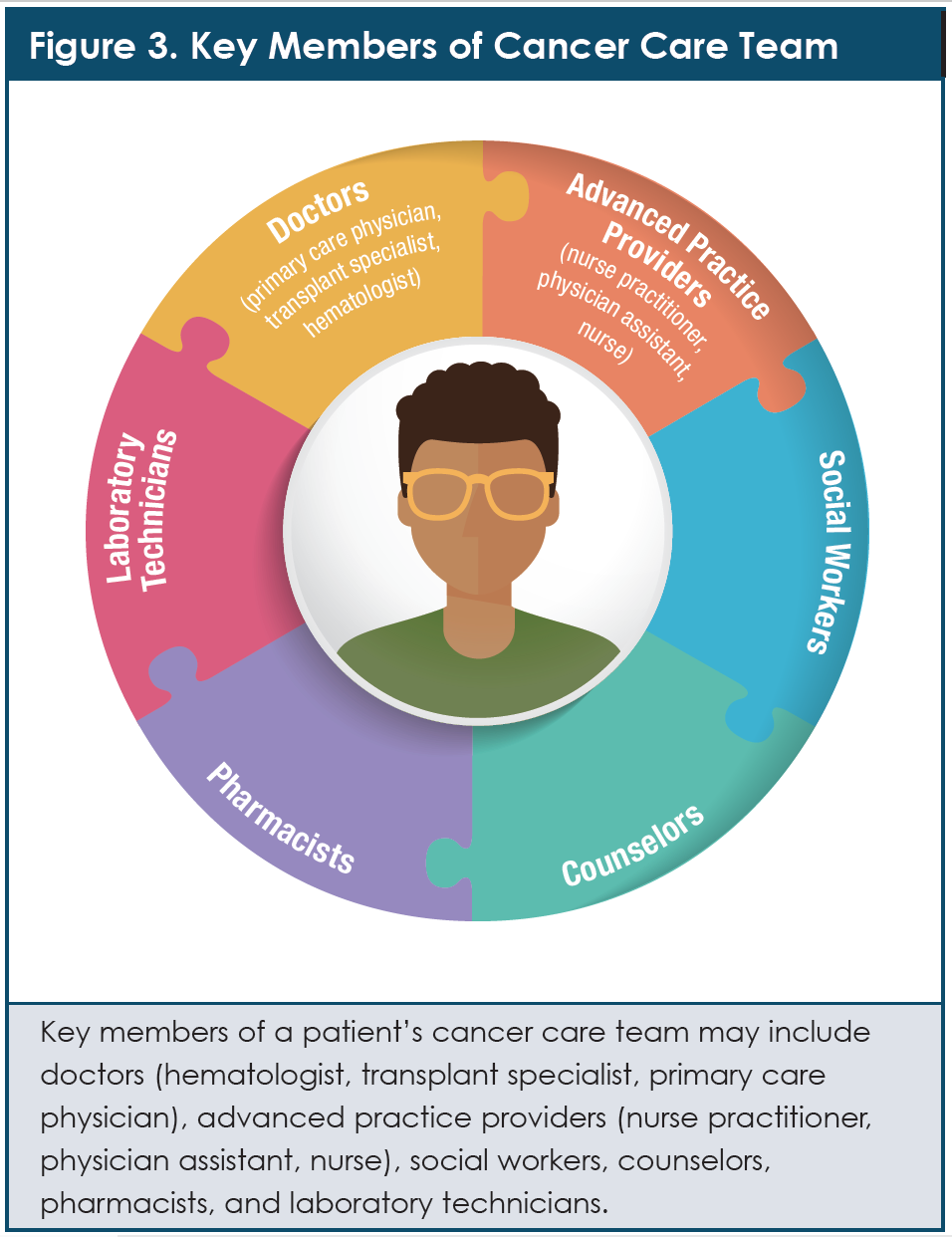Whenever possible, multidisciplinary healthcare teams should work together to decide which treatment choices are most appropriate at each point in the patient’s journey. Multidisciplinary teams include several different types of cancer care providers (Figure 3), each of whom have unique perspectives. Whether this team is large or small, the members should work together, communicate often, and keep the patient’s needs and wants the top priority when making recommendations.