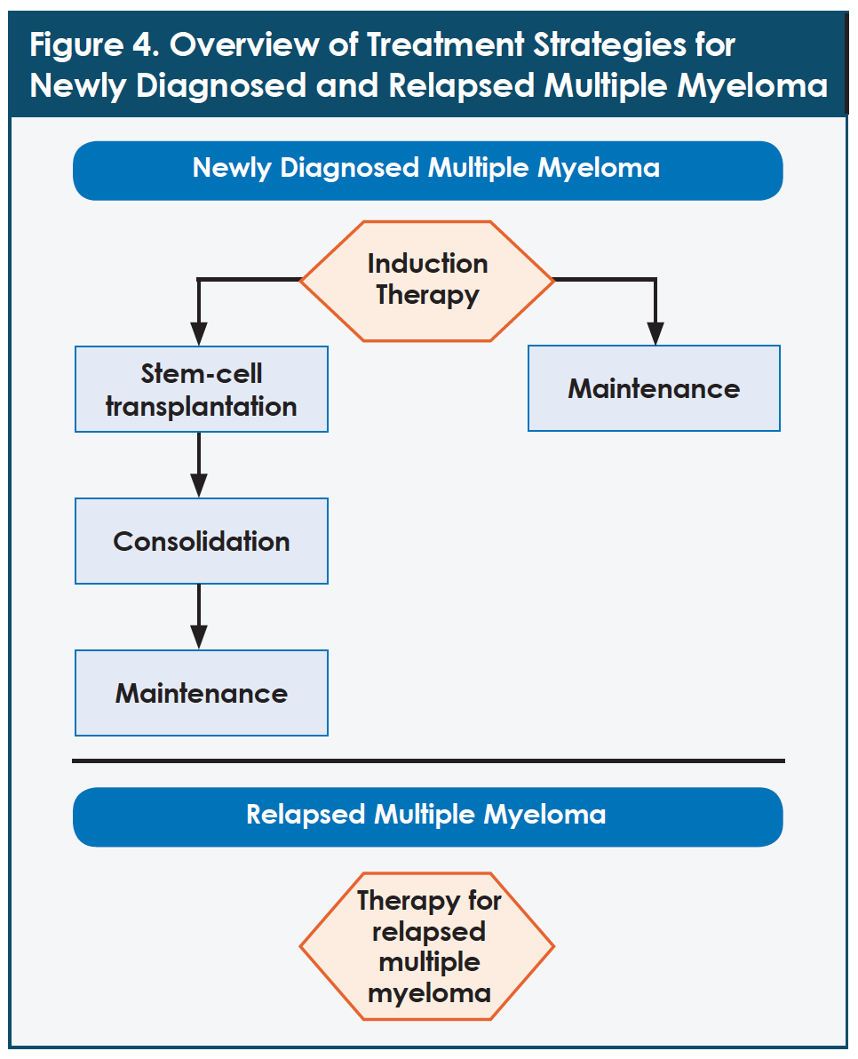 Based on educational materials provided by the National Comprehensive Cancer Network (NCCN), a not-for-profit alliance of 27 leading cancer centers in the United States, Figure 4 provides a simplified overview of the treatment approaches that can be considered for a patient with multiple myeloma at the point of diagnosis and at relapse.15 Of note, some treatment regimens contain 3 drugs (triplet regimens), whereas others contain 2 drugs (doublet regimens). Some drug treatments are used during the induction phase of treatment, whereas other drug treatments (and stem-cell transplant) are used during the consolidation phase of therapy. (An in-depth discussion of these terms is beyond the scope of this article. However, free educational materials provided by the NCCN offer patients and their caregivers a valuable overview of these topics and many others.15)