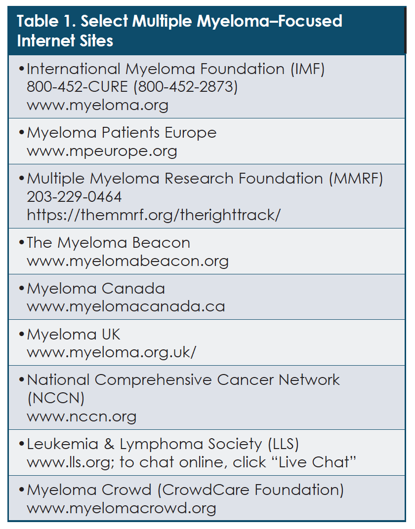 Which websites are best? The patient advocates believe that patient organizations offer trustworthy resources, as well as support for people with multiple myeloma. Pharmaceutical companies who make treatments for patients with multiple myeloma also have valuable educational resources and support programs. Table 1 provides a select list of multiple myeloma–focused Internet sites that were discussed during the Roundtable, including links to patient organizations dedicated to supporting the needs of people with multiple myeloma. The patient advocates noted that these free, reliable, and supportive websites give patients the chance to connect and learn. Doctors and nurses should also refer patients and their caregivers to support groups or patient organizations that can help them obtain answers to their questions, gain insight and support, and ultimately feel more comfortable talking with the healthcare team.