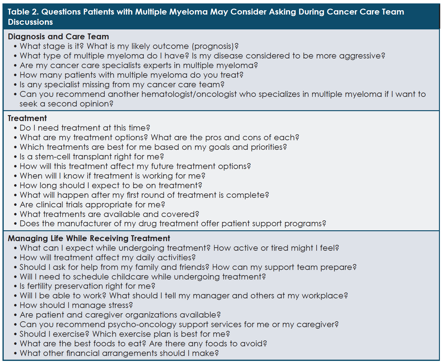 Patients with multiple myeloma cannot be expected to understand which treatment options are best for them, which sequence of available therapies is optimal, or which treatments will ensure good quality of life. Their cancer care team is responsible for sharing information about each relevant option, guiding them through decisions, and advising them when new decisions need to be considered. However, this does not mean that patients should be passive. Table 2 lists questions that patients with multiple myeloma may want to ask their cancer care team.17