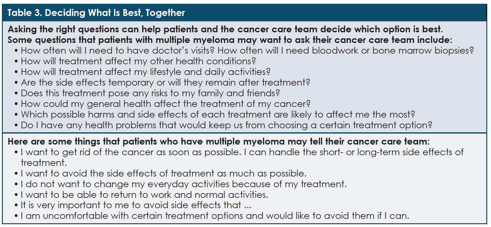 The term “shared decision-making” really means mutual information-sharing. The multiple myeloma care team should help patients understand the decisions they are facing, and patients should be able to help providers understand their needs, values, and preferences about these decisions.18 Ideally, patients with multiple myeloma and their doctors and nurses then come to an agreement about the treatment plan.18 Although taking a more active role may seem scary to some patients, resources are available to help, including lists of questions to consider (Table 3).19