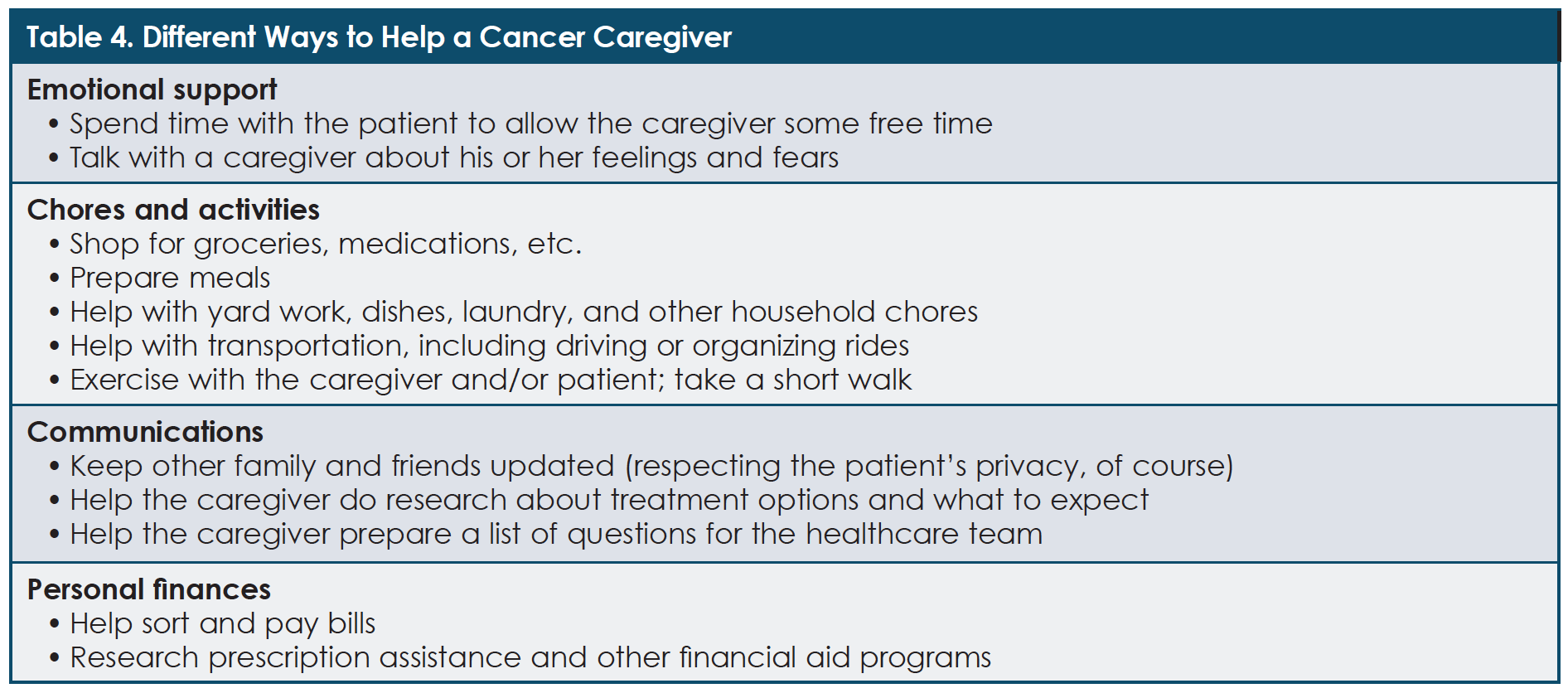 Table 4 provides some strategies for helping cancer caregivers.20 There are also numerous organizations that can provide support to caregivers, including CancerCare (www.cancercare.org), the Family Caregiver Alliance (www.caregiver.org), and Caregiver Action Network/Help for Cancer Caregivers (www.caregiveraction.org; www.helpforcancercaregivers.org). Myeloma UK (https://www.myeloma.org.uk/help-and-support/support-for-carers/) also has information on its website designed specifically for caregivers.