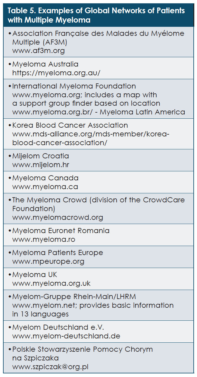 For patients with multiple myeloma around the globe, it is rewarding and valuable to belong to a community of people who can share experiences, ideas, and insights. Knowing that social media channels and other websites can offer valuable opportunities for interaction and support, multiple myeloma advocates have created specific resources for patients in many languages. Table 5 provides examples of national and regional websites that patients and their caregivers can use to find information about multiple myeloma and connect with others.