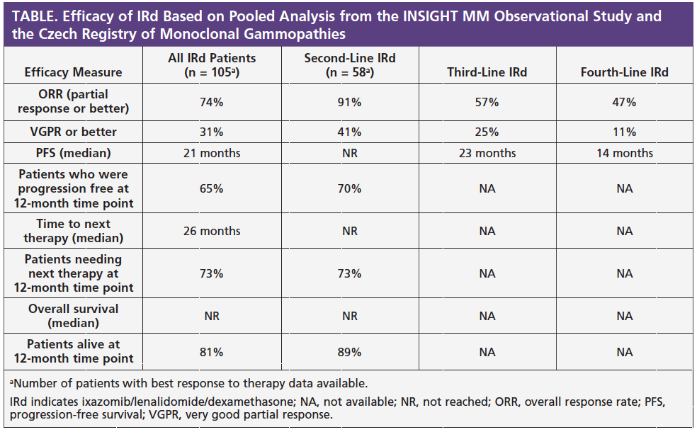 To evaluate the efficacy of the combination of ixazomib/lenalidomide/dexamethasone (IRd) in real-world patients with relapsed and refractory multiple myeloma, researchers analyzed patient-level data from the ongoing INSIGHT MM study using data from the Czech Registry of Monoclonal Gammopathies (RMG). INSIGHT MM, the largest global, prospective, observational study of its kind to date, is enrolling approximately 4200 adults with newly diagnosed or relapsed/refractory multiple myeloma from around the world: Europe, United States, Asia, and Latin America. The Czech RMG, which the Czech Myeloma Group initiated in 2007, includes clinical data for more than 6000 patients with multiple myeloma who enrolled at 1 of 19 Czech and 4 Slovak cancer centers.
