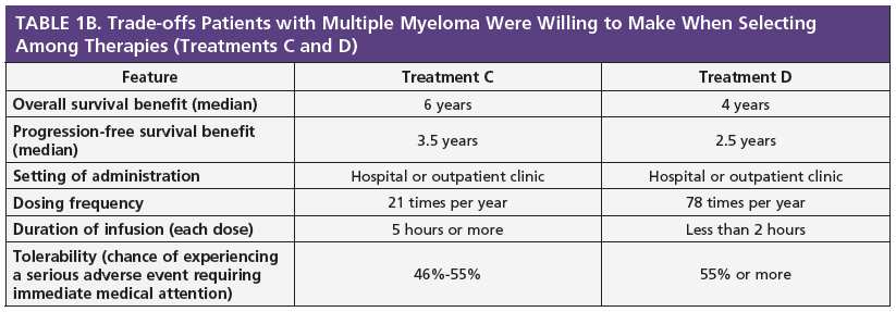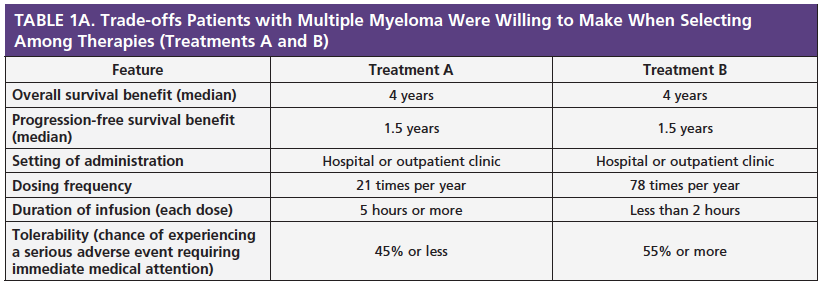 Patients were asked to rate the importance of each treatment attribute, such as response rate and whether it is oral or intravenous, using a 5-point scale, ranging from 1 (very bad) to 5 (very good). They were then asked to pick which treatment regimen they preferred between 2 different hypothetical treatment regimens. The goal was to identify trade-offs that patients were willing to make when selecting among treatments (see examples in Table 1A and 1B).
