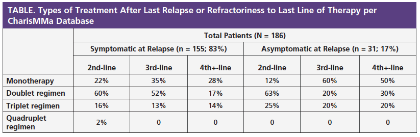 Patients who had symptoms of multiple myeloma at the time they relapsed were treated mainly with doublet (2-drug) regimens, both in the second-line setting (60%) and in the third-line setting (52%). The small group of patients who relapsed with multiple myeloma and who did not have symptoms were more likely to be treated with doublet regimens in the second-line setting (63%) and with a single agent in third-line regimens (60%) (Table).