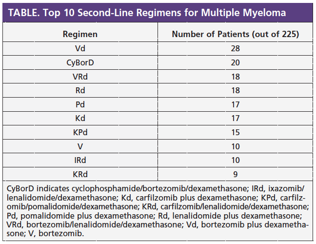 The Table shows the top 10 second-line regimens these patients received. Regimens included both triplet+ regimens (3 or more drugs combined) and doublet regimens (1 drug or 2 drugs combined). Specifically, approximately 50% of patients switched to proteasome inhibitor (PI) regimens without immunomodulatory drugs (IMiDs), 25% continued with an IMiD plus a PI, and 25% continued with an IMiD.